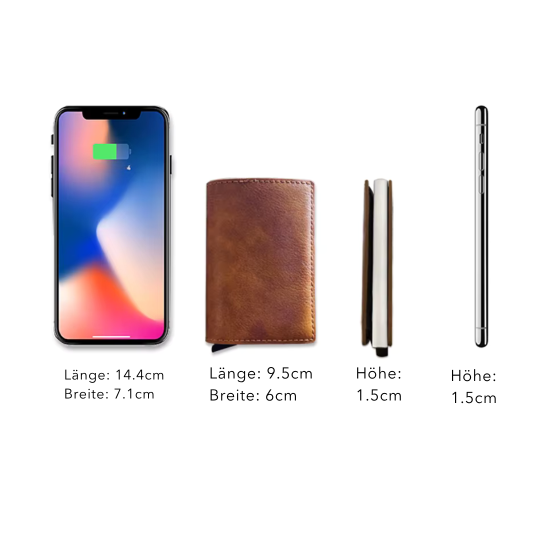 Mit nur 9 × 6 × 2 cm passt das Wallet perfekt in jede Hosentasche und bietet dennoch Platz für mehrere Karten und Noten.